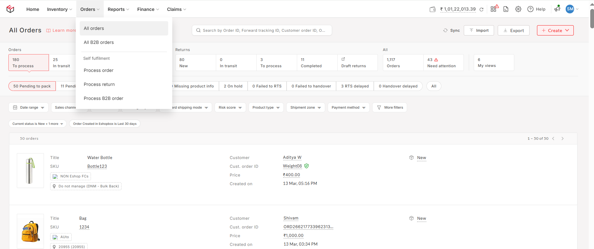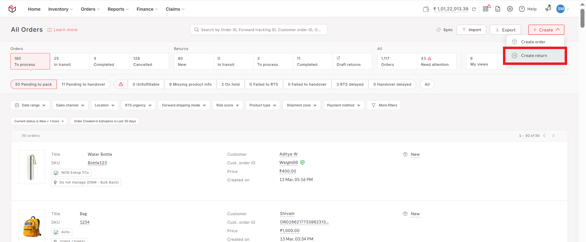 Handling returns is a regular part of order management, and Eshopbox makes this process simple and quick. You can create returns directly using your Eshopbox Workspace.