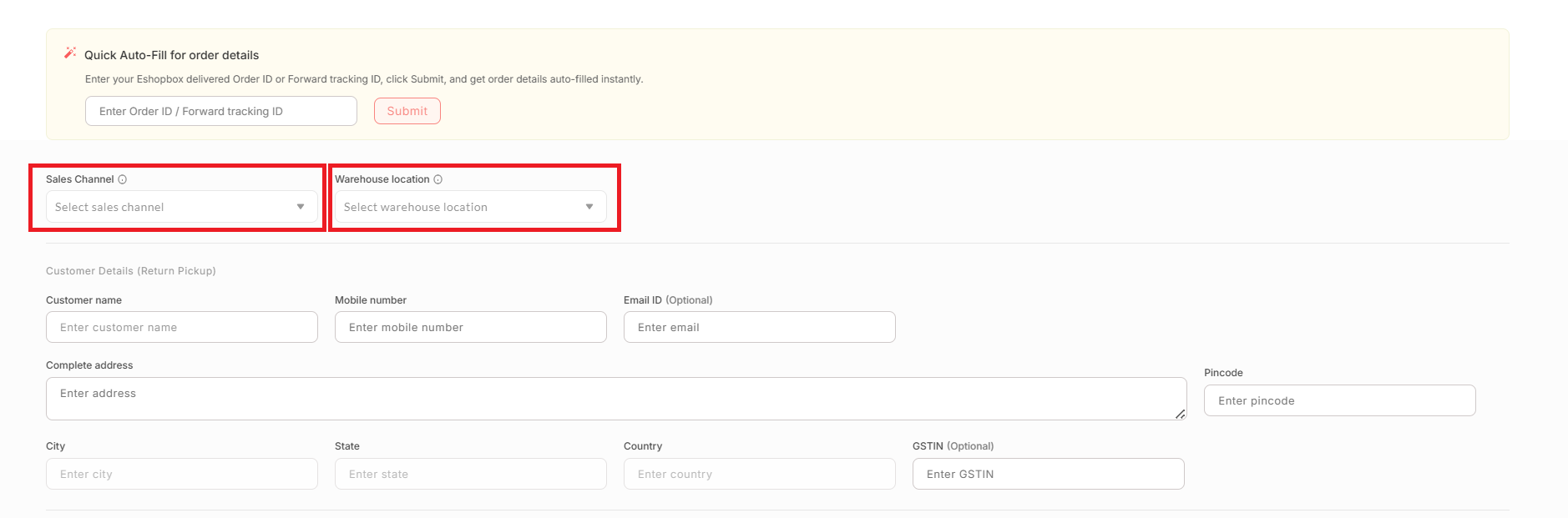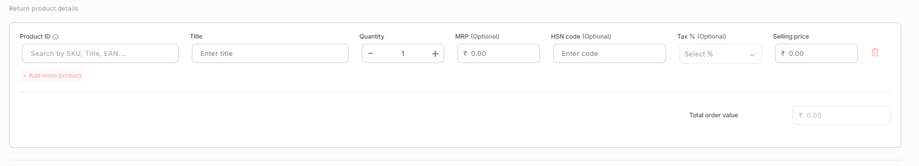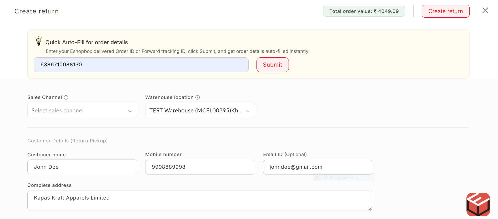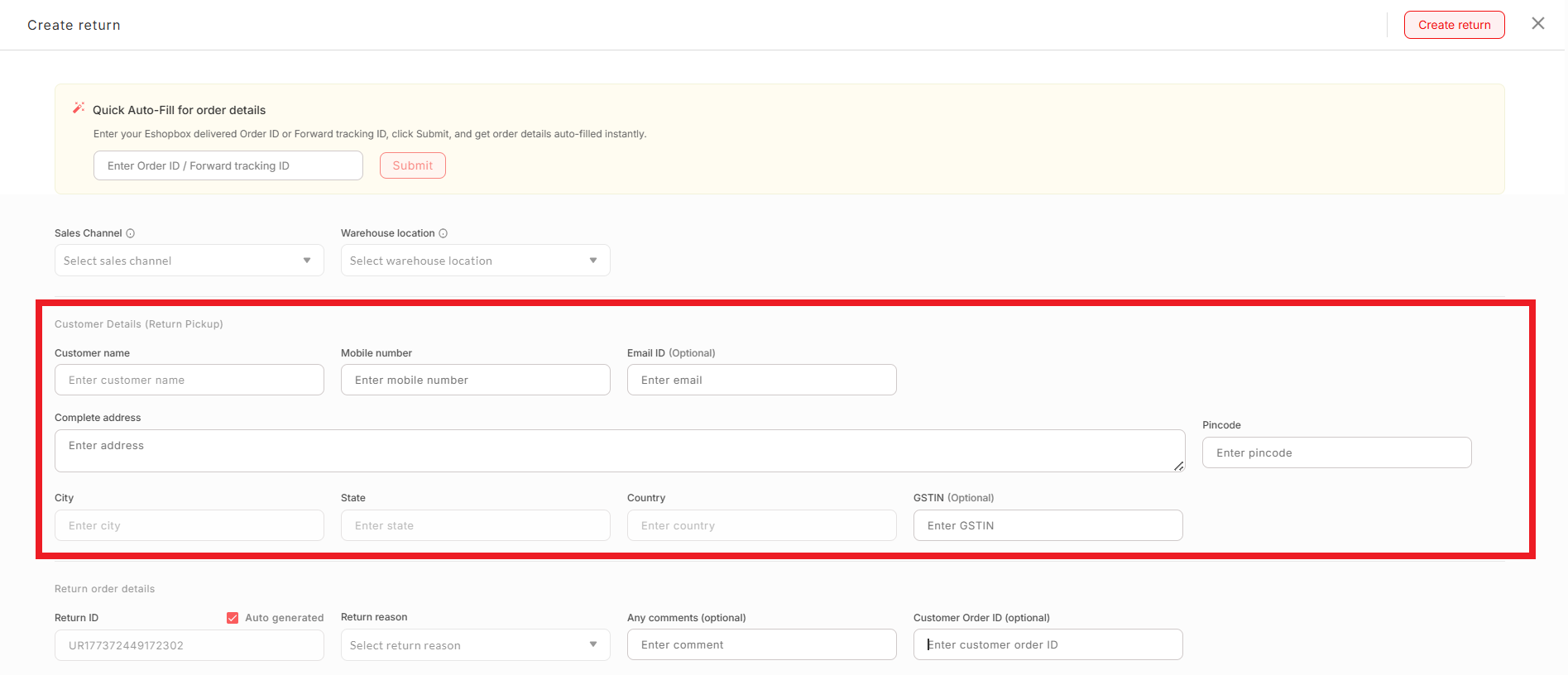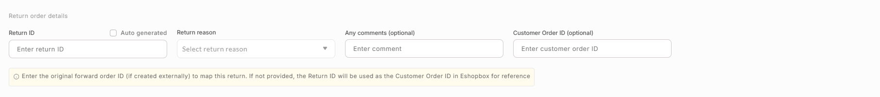 In case forward order is not created in Eshopbox workspace. You can still create a return by entering the details manually to proceed with return creation.