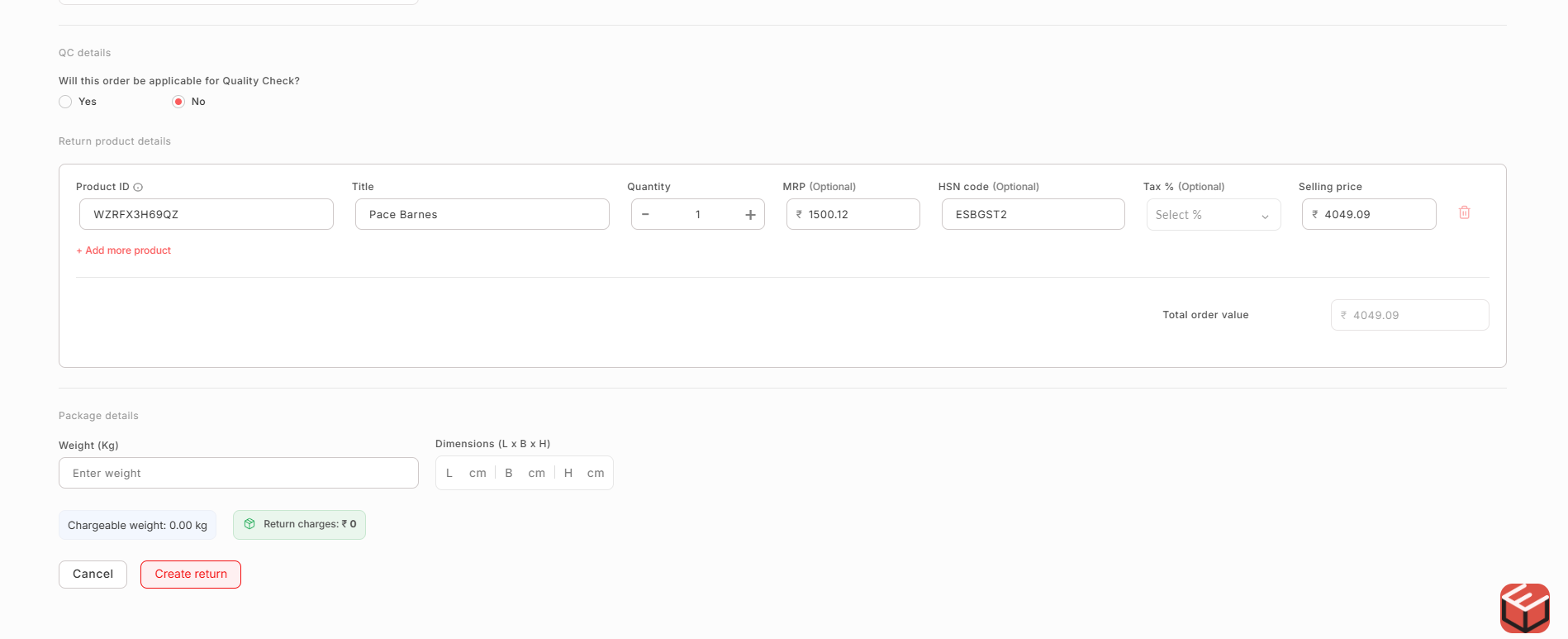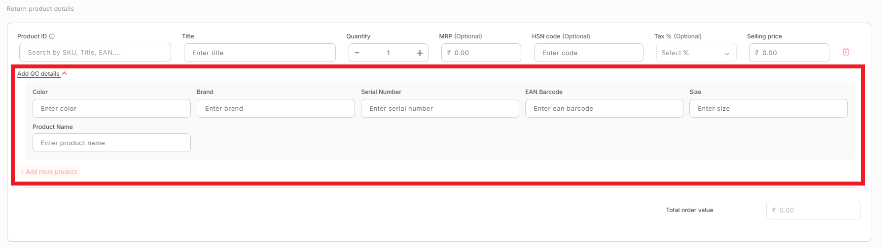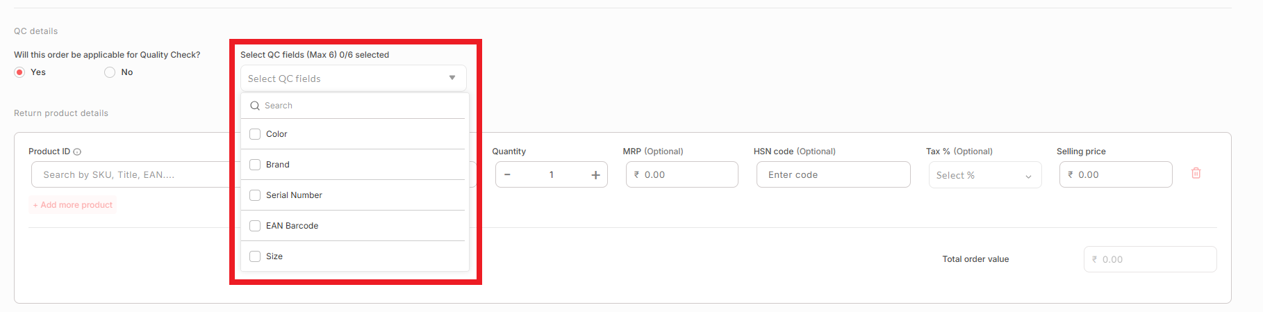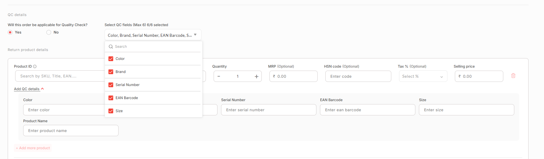 When you select QC fields, you must provide the corresponding QC details in the Return product details section.