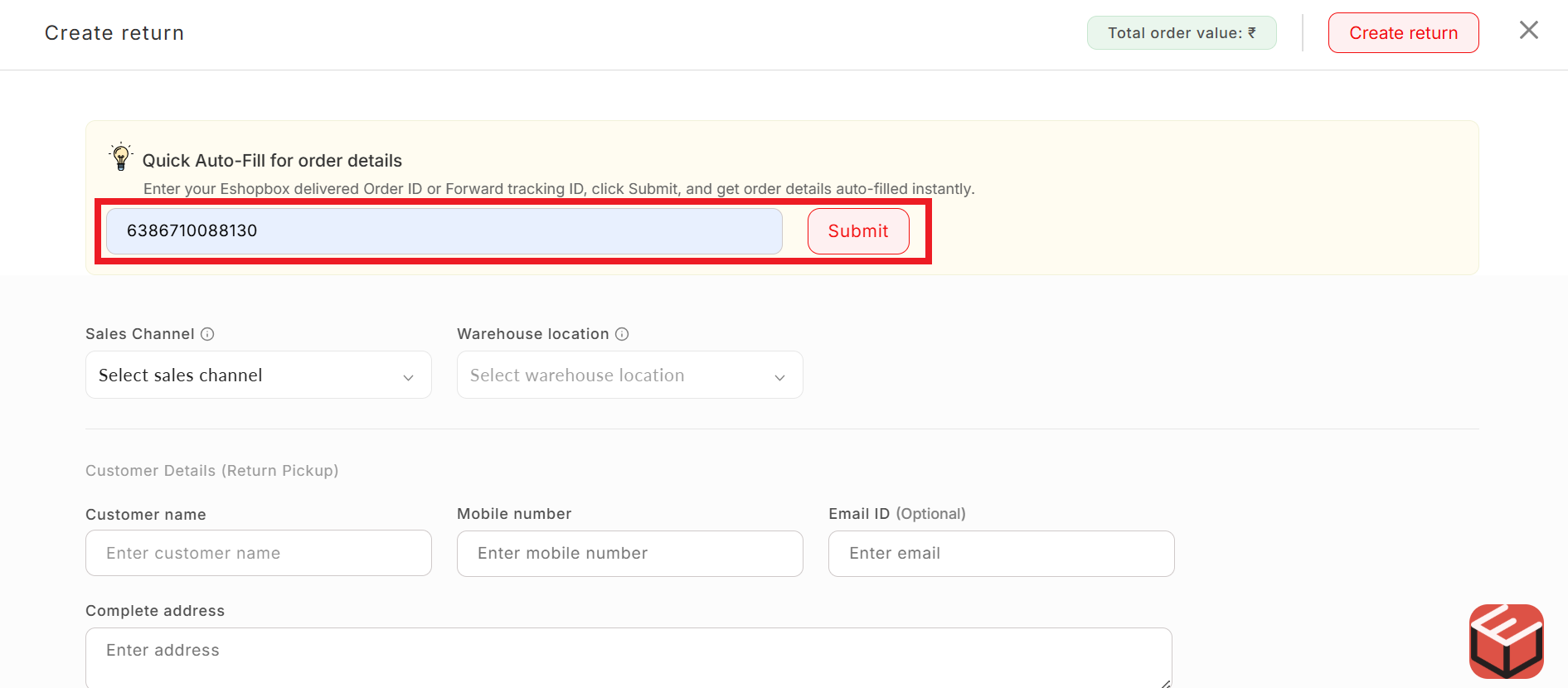 Step 4: The Create Return page opens. Enter the Order ID or Forward Tracking ID and click on Submit button